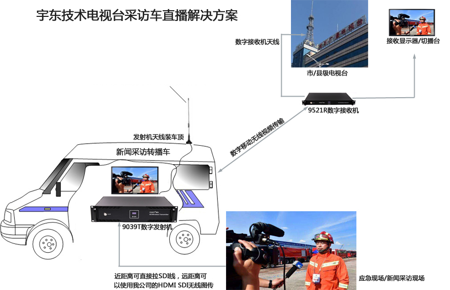 廣播 電視臺現場采訪車無線視頻信號遠距離傳輸,直接在車上安裝車載無線圖傳系統,配合車載播出系統切換系統,能實時將多路攝像頭信號,任意切換后通過無線發射,直接在電視臺播出機房接收到現場信號,再通過光纖鏈路,傳輸到電視發射塔,通過開路電視發射出去,也可以通過有線電視線路傳輸。指揮中心或者老百姓就可以通過足不出戶,看到活動場面的實時畫面。