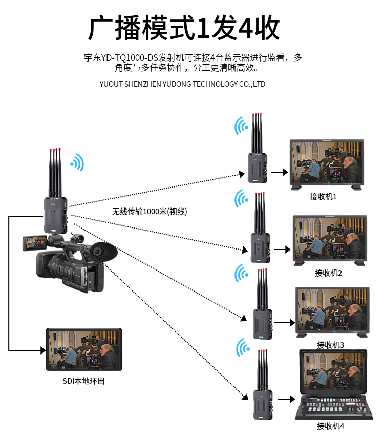 YD-TQ1000-DS是由發(fā)射端和接收端組成,支持3G/HD/SD-SDI或者HDMI 1080P全高清信號傳輸,作為圖傳時,視線無阻擋傳輸距離1000至1500米。頻段采用5.1-5.8GHz,支持用戶手動通信頻點調(diào)整,為發(fā)射端和接收端配對,還支持廣播模式,可以把多個接收端設(shè)置成跟一個發(fā)射端相同的頻點,實現(xiàn)一發(fā)多收。純硬件連接操作,簡單可靠。設(shè)計精巧,可以F970 、V口、 電源適配器三種供電方式,方便移動拍攝。廣泛應用于電影拍攝、應急搶險、消防、人防、武警、突發(fā)事故單兵視頻采集等場合;真正實現(xiàn)高清無線傳輸、移動實時傳輸.