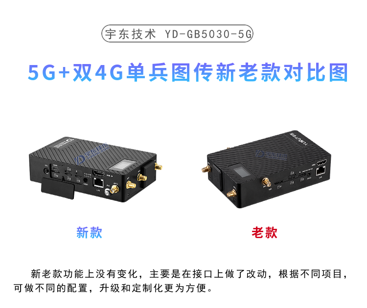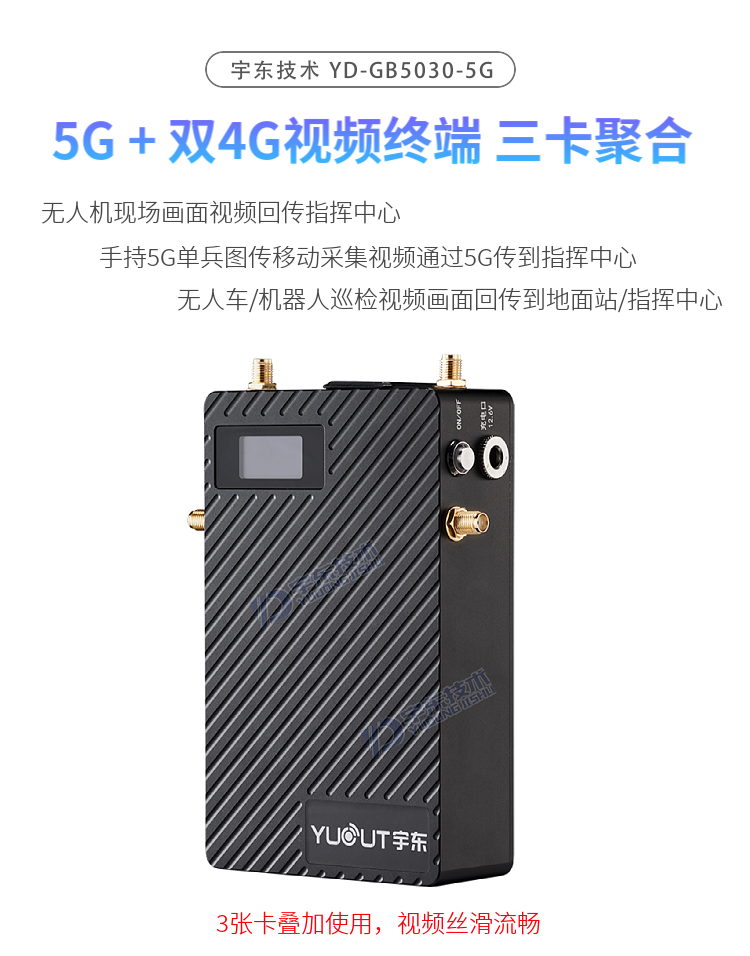 YD-GB5030-5G單兵圖傳,具備三個SIM卡槽,同時支持一個5G網絡和兩個4G網絡, 5G便攜式多卡高清視頻終端采用嵌入式系統架構,采用高性能H.265編解碼處理器設計。設備支持視頻采集、編碼壓縮、傳輸、雙向對講功能。