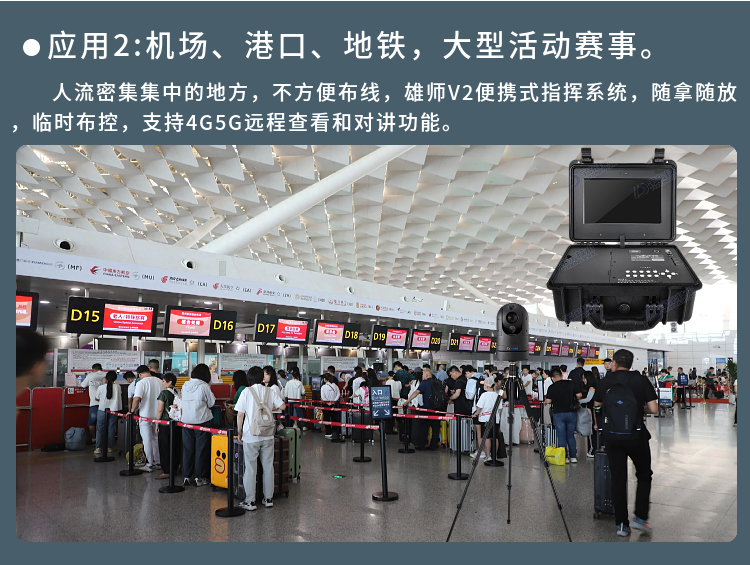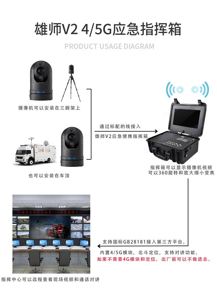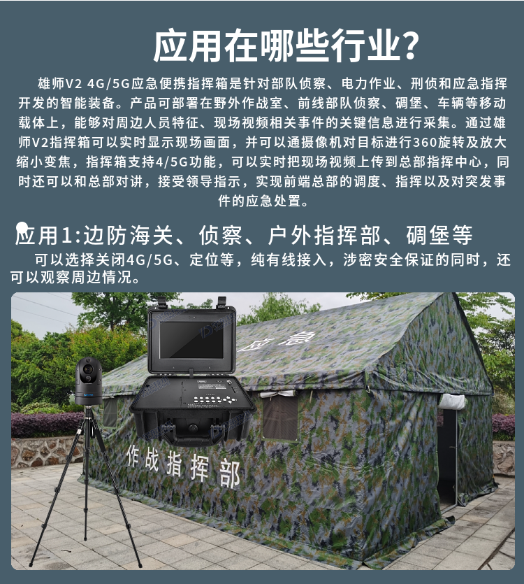 雄師V2 4/5G高清應(yīng)急便攜指揮箱是一款功能全面、攜帶方便的無(wú)線視頻指揮一體化產(chǎn)品,超高設(shè)備集成度,內(nèi)置高性能鋰電池組,具備防水防震等特性的應(yīng)急指揮箱,可滿足臨時(shí)布控和快速安裝的特殊要求。執(zhí)行任務(wù)時(shí)可快速將設(shè)備臨時(shí)安放在需要監(jiān)控的位置或直接吸附在車輛上,任務(wù)結(jié)束時(shí)可方便將設(shè)備拆下,適用于外勤執(zhí)法、偵查布控、安防安保、應(yīng)急指揮、搶險(xiǎn)搶修、巡線管理等行業(yè)應(yīng)用,比如公安、交警、消防、路政、城管、交通、法院、監(jiān)獄、林業(yè)、電力、水利、環(huán)保等單位。為用戶提供高清、流暢、穩(wěn)定的視頻效果,能實(shí)現(xiàn)北斗定位、遠(yuǎn)程視頻查看、雙向語(yǔ)音對(duì)講、錄像保存回看等功能。“聽(tīng)得到、看得見(jiàn)”是針對(duì)突發(fā)緊急事件的一整套應(yīng)急指揮設(shè)備,為實(shí)現(xiàn)應(yīng)急指揮的“通信暢通、現(xiàn)場(chǎng)及時(shí)、數(shù)據(jù)完備、指揮到位”提供技術(shù)保障,可廣泛應(yīng)用于應(yīng)急指揮、公安、刑偵、交巡警、消防、部隊(duì)、人防應(yīng)急、邊防、城管、電力、路政等領(lǐng)域。