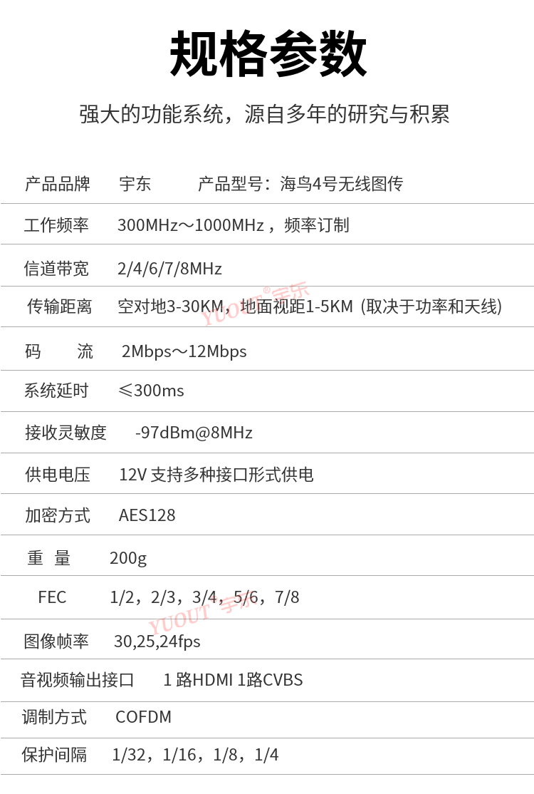宇東海鳥4號無線圖傳高清微型無線視頻傳輸系統(tǒng),采用Coded Orthogonal Frequency Division Multiplexing:編碼正交頻分復用調制技術,具有傳輸頻帶窄、很強的抗多徑干擾能力和抗多徑衰落能力,能夠實現非視距(NLOS),高速運動情況下實時傳輸高質量圖像。