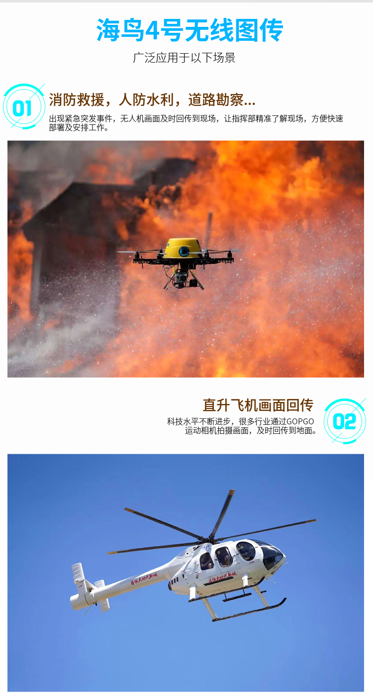 廣泛應用于軍事偵察、邊防巡邏、公安技偵、航拍、空中測繪、電力巡查、鐵路搶險、海事執(zhí)法、城管執(zhí)法、新聞密訪、衛(wèi)生防疫等或突發(fā)事件應急指揮、無人車、無人船、特種機器人等領域。設備體積小可偽裝做密訪取證、空中作業(yè)圖傳、無人機無線圖像傳輸。