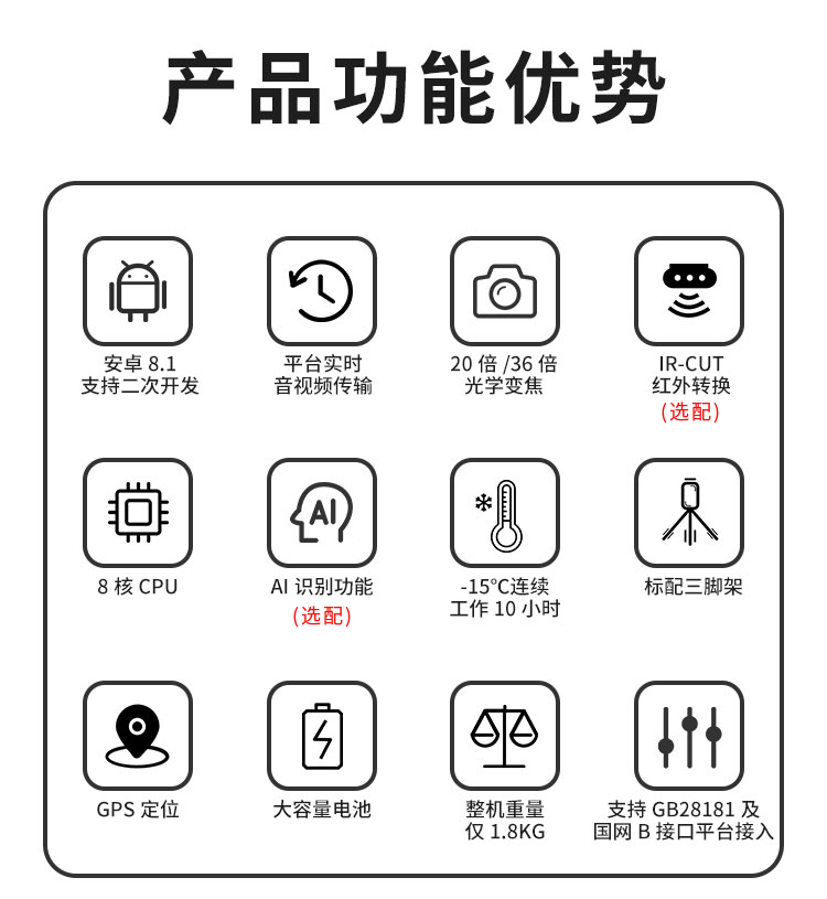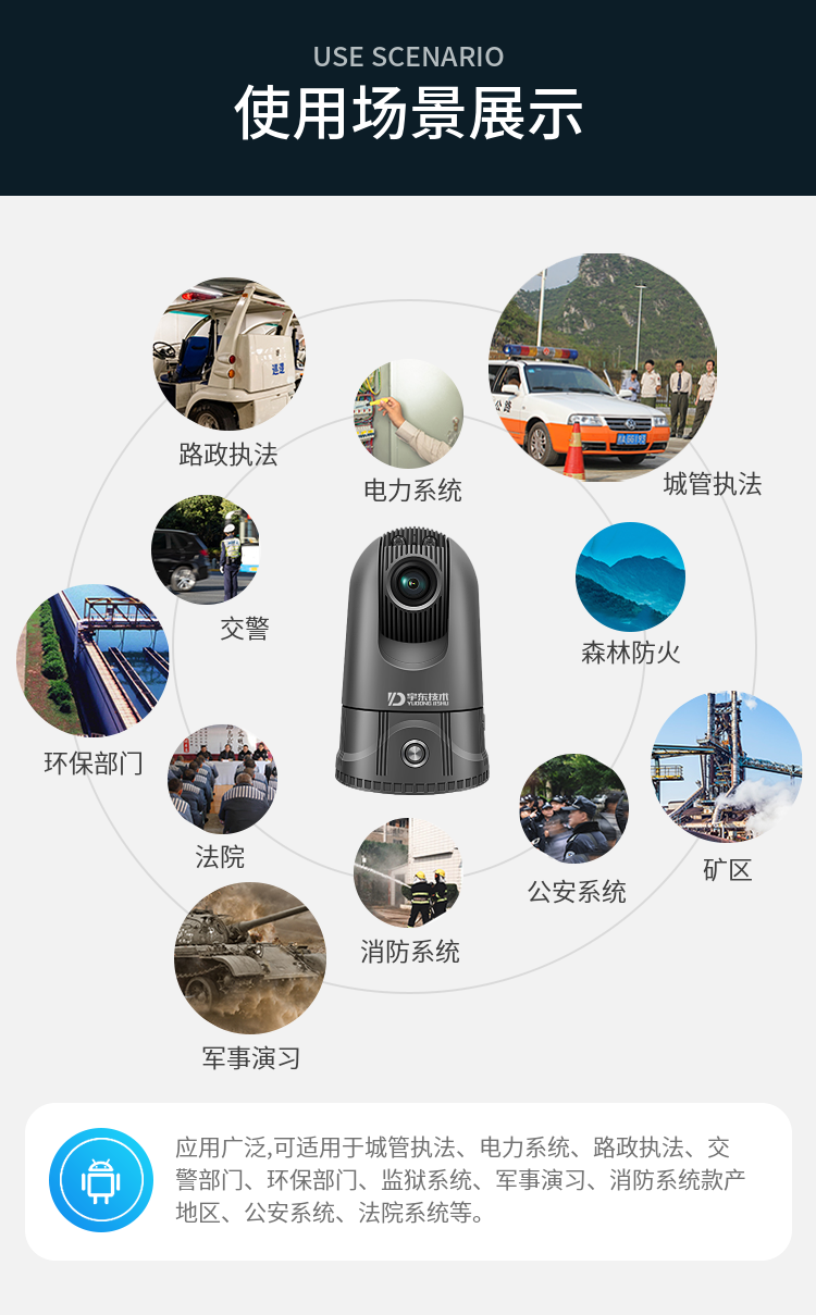 4G高清AI智能布控球 * AI智能識別,更清晰·快傳輸·識強 * 輕量化,整機重量僅1.8KG * Android 8.1 8核,20倍/36倍光學變焦 * AI智能識別,可人臉識別、車輛識別、安全帽識別、工服識別、銘牌識別等等。 * 2T大容量,支持雙sim卡、雙t卡,最高2T內存 * 在線傳輸,作業現場隨時看,可視化平臺調度指揮 * 電子地圖實時檢測人員、設備、事件、區域信息 * 第一時間掌握現場情況,遠程決策,統一協調?